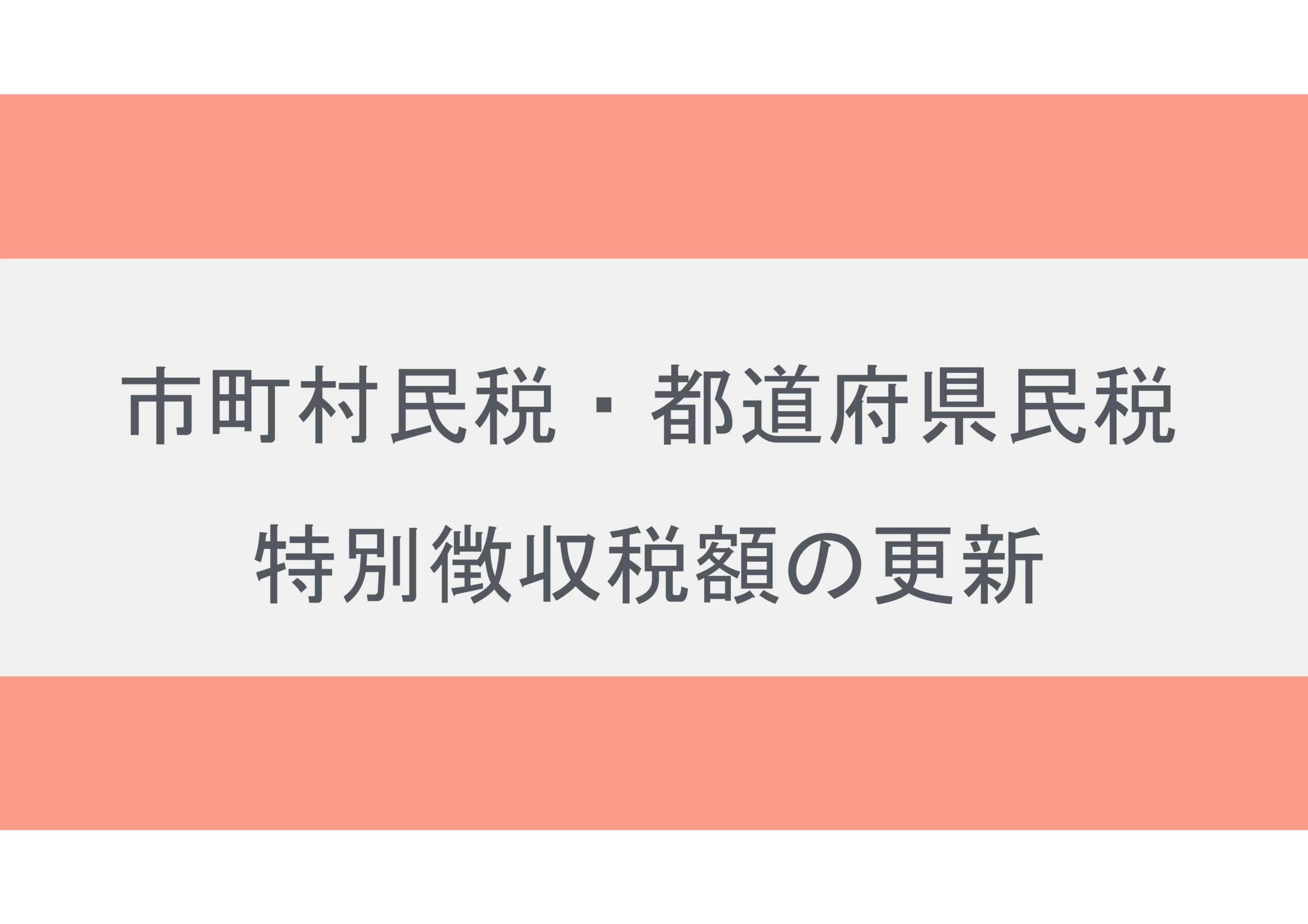 市町村民税・都道府県民税 特別徴収税額の更新 2022 9/21 給与計算実務ブログ 2022年5月12日2022年9月21日5月中旬になりますと、各市町村より令和4年度特別徴収税額の決定通知書が送られてきます。令和4年6月分~令和5年5月分の特別徴収税額となります。お早目に更新を済ませて、6月の給与計算に間に合うようにしましょう。また、通知書に退職している従業員が記載されている場合は、各市町村へ給与所得者異動届出書の提出が必要となります。退職日等の情報を記載し、普通徴収へ切り替え手続きを行ってください。 給与計算実務ブログ